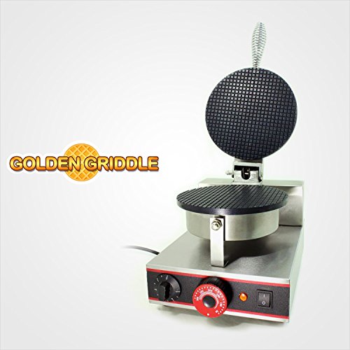 Description: The Golden Griddle GG-X1 Waffle Cone maker is made for high performance commercial performance. Make up to 60 waffle cones per hour, with this simple to use, elegant stainless steel waffle iron that has two knobs for easy function. One knob is for temperature and the other knob is a timer. We recommend 1-2mins for waffle cones and waffle bowls - please see video above. This unit is used by ice-cream shops and frozen yogurt shops all across the Country and you will get decades of service from this stalwart work horse of a machine.The advanced Continuous Heating Balance Technology, this allows the unit to heat up evenly and extremely quickly while maintaining constant temperature so you get consistent results every time.. With 8" diameter, self-curing (non-stick) surface, timer, temperature, UL and NSF listing, the Golden Griddle GG-X1 is a fully loaded professional waffle maker that is second to none.