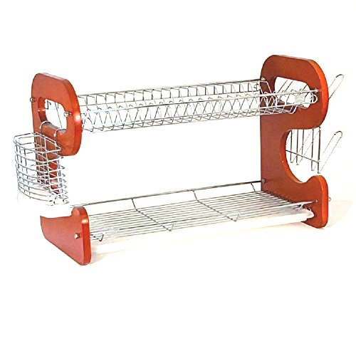 Faux Wood Chrome Plated Steel 2 Tier Double Kitchen Dish Rack 22"
