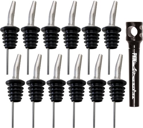 Free Flowing Stainless Steel Liquor Bottle Speed Pourers with Tapered Spout and PNW Pocket Corkscrew, Set of 12
