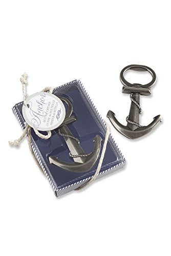 Description: Weddings, anniversary parties and family reunions have found a welcoming venue on cruise ships and Kate Aspen has a popular party favor perfect for celebrations in ocean-going paradise or a beach-themed event! Our antique anchor bottle opener pops with pure gratitude! Features and facts: Pewter-finish metal anchor bottle open with rope detail. Bottle opener measures approximately 2 3/4" h x 1 1/2" w. Gift presentation includes blue-and-white-striped base with clear cover, white rope tie and bow and round, coordinated hang tag. Gift box measures 3 1/4" h x 2 1/4" w x 5/8" d.