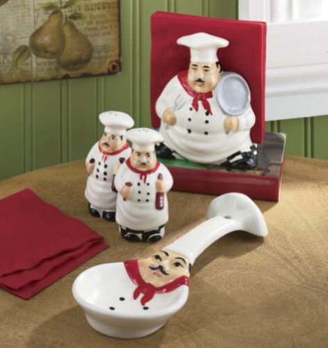 - New Tuscany Plump Bistro Chef Ceramic 4pc Set, Napkin Holder, Salt, Pepper and Spoon Rest set, 88925/28 by ACK