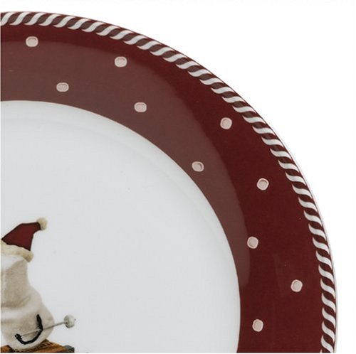 Complementing other pieces in the same Let It S'more motif, the plates are glazed creamy white in the center while the border is saturated a deep cranberry red dotted with snowballs. A candy-cane rim adds the final festive touch. Crafted of durable ironstone, the mug is safe for the oven, microwave, and dishwasher. --Ann Bieri