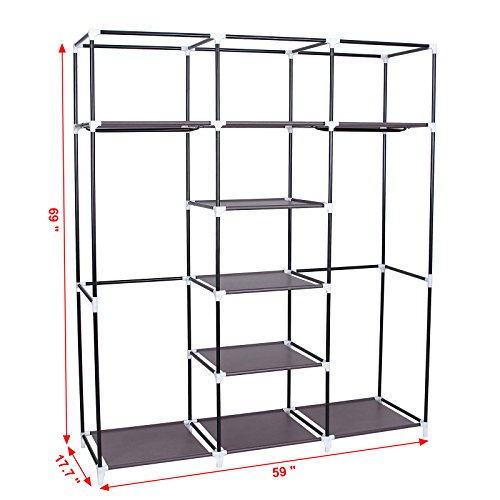 Description: Protect your seasonal clothes or daily accessories with this Songmics 59" portable closet. It makes a great addition to any home with storage issues. 2 hanging rods and 9 shelves offers roomy space for hanging clothes and storing garments or other stuffs, like shoes, bags, baby toys, hats etc. The fabric cover protects your garments from dust, moths and dirt, and then makes your room neat.