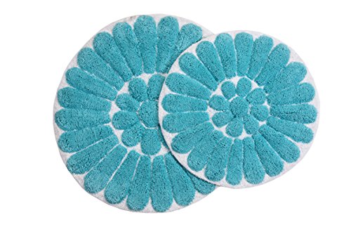 Description: Two-piece bath rug set with a bold floral design will be sure to add a burst of color to your home! Your bathroom decor will take on a fun and whimsical tone with the addition of these Bursting Flower rugs. Plush fabric cushions your feet for pure comfort, water-absorbent construction ensures lasting quality. Machine tufted, 100% cotton with a lightly sprayed anti-skid back. Set includes one-24" round bath rug and one-30" bath rug.