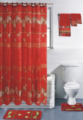 Description: Complete 18-Piece Bathroom Set for this Holiday Season: Set includes: Fabric shower curtain, bath rug, contour mat, 12 pcs fabric covered rings, bath towel, hand towel, wash towel. With this gorgeous set you could dress up your home upcoming Christmas season!.
