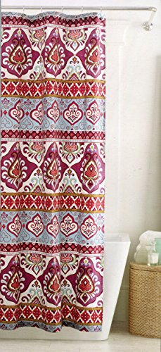 Description: Exotic Ikat medallion style pattern in this predominantly turquoise blue and burgundy cotton fabric shower curtain. Measures 72" x 72". (Liner and hooks not included.)