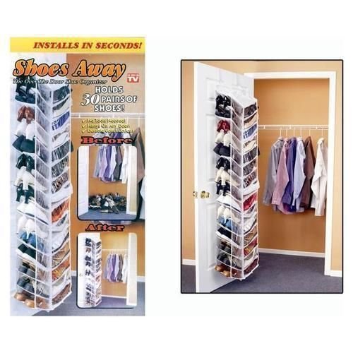 Description: Get rid of the pile of shoes in front of your door piled?in your closet and on?under your bed.?Now you can?place them all in this convenient door hanging shoe holder. Store your shoes together in pairs dont every leave home with two different shoes again. Get organized with shoes away!No Tools NeededHangs on any doorDurable ConstructionHold 30 pairs of shoesinstalls in secondsAs Seen On TV. Overdoor shoe holder rack organizer for shoes installs in seconds! Simply attach the hooks to any door, then slip the hooks through the loops at the top of the shoe organizer.