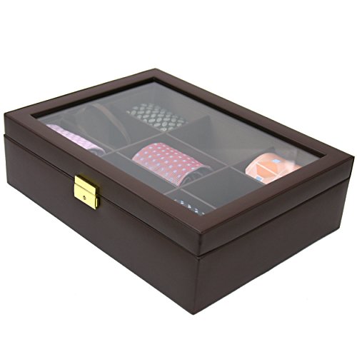 Description: Keep your ties neatly organized in this stylish tie, bow tie or belt box by Tech Swiss. The valet features 9 separated compartments, glass lid, lock, and key to store your selection of accessories. The interior lining with a black geometric scheme. This Case is perfect for displaying, and organizing your favorite accessories while preventing them from wrinkling or gathering dust. Designed to keep on a bureau, desk, desser or stashed securely in the closet. This functional piece that makes an excellent great gift for men of all ages. Dimension: L 14.25" x W 10.75" x H 4" Compartment Size: 4.50" x 3.5" x 3" H Includes Complementary Microfiber Polishing Cloth. Exclusively by Tech Swiss