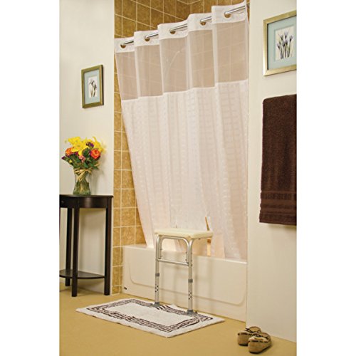Description: Hookless? Transfer BenchBuddy? Shower Curtain - 74L x 71"W - Designed To Be Fully Compatible With All Brands Of Transfer Benches - Helps To Keep Water Off The Floor By Allowing The Entire Shower Curtain To Remain Inside The Shower - Easy On/Off Hookless Rings - Easy Care Washable And Durable Water Repellent Textile - Litchfield White - Sheer Window Lets In Light.
