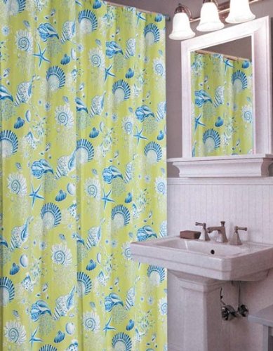 Description: 72x72"shower Curtain. High quality material and workmanship. Lime green with random repeating pattern seashells and starfish, in shades of blue with white.