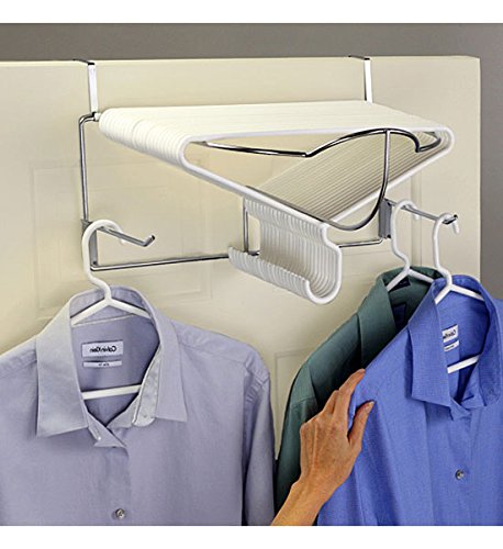 Description: The Deluxe Over the Door Hanger Holder neatly organizes all your hangers in one location so you do not have to hunt for them on laundry day or have them take up space in your closet. The hanger rack can hold up to 100 wire or 50 plastic hangers and has two swing out rods that you can hang clothes on to drip dry. Two over the door hooks come with the rack and they can accommodate any size door. The organizer is constructed from lightweight metal making it easy to lift and carry. Whether you place the holder in the laundry room or the closet it is sure to save you time and space. Deluxe Over the Door Hanger Holder Features Holds 100 wire or 50 plastic hangers. Makes it easy to carry dozens of hangers to another room for convenience. Saves space in your closet and saves you time from hunting down hangers. Two swing out rods allow you to hang up clothes to keep them wrinkle free. Constructed from lightweight metal to make it easy to carry. Organizes hangers and clothes in the close