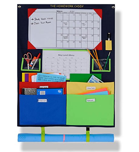 Description: The Homework Station can help you and your child stay organized during the school year. This durable homework caddy has four large pockets to hold papers reports books and files. A dry erase board at the top of the organizer helps your child remember important events and dates coming up later in month. A dry erase marker is included and it even has its own pocket. A display window in the middle is wonderful for housing a sports schedule or lunch menu. Store a supply of pens glue sticks pencils and other small items in the two see through pockets on either side of the display pocket. Two Velcro straps on the bottom of the caddy keeps rolled up poster board handy for your childs next school project. This organizer has two eyelet holes and includes two removable adhesive hooks so you can hang it up on the back or your childs door or on the wall. The caddy measures 28 wide by 36 inches high which fits most standard door frames. Makes a wonderful gift. Homework Station Features Makes a
