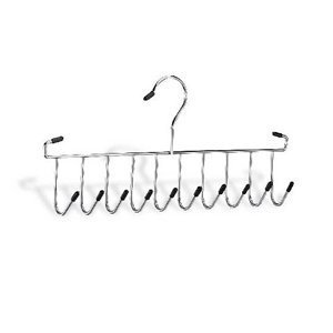 Description: Keep your ties and belts neatly organized with this Chrome Tie and Belt Rack Hanger. Features Ten hooks to accommodate multiple belts, ties, scarves and other clothing accessories. Rubber coating on tips protects from damages to accessories. Fits any standard size closet rod.