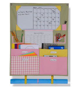 Description: The Homework Station can help you and your child stay organized during the school year. This durable homework caddy has four large pockets to hold papers reports books and files. A dry erase board at the top of the organizer helps your child remember important events and dates coming up later in month. A dry erase marker is included and it even has its own pocket. A display window in the middle is wonderful for housing a sports schedule or lunch menu. Store a supply of pens glue sticks pencils and other small items in the two see through pockets on either side of the display pocket. Two Velcro straps on the bottom of the caddy keeps rolled up poster board handy for your childs next school project. This organizer has two eyelet holes and includes two removable adhesive hooks so you can hang it up on the back or your childs door or on the wall. The caddy measures 28 wide by 36 inches high which fits most standard door frames. Makes a wonderful gift. Homework Station Features Makes a
