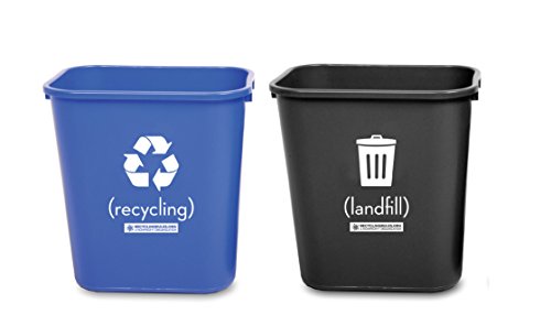 Description: Welcome to Recycling Rules! We are a 501(c)(3) non-profit organization that helps you start or enhance a recycling program. These coordinating small deskside trash & recycling bins are perfect for the office. The most successful recycling programs place trash and recycling containers side by side. You'll be sure to increase your participation rate with a set of coordinating bins. Not much larger than a ream of paper, they're an attractive deskside solution or where ever you may need them. Great beside a printer too. Made in North America with a minimum of 35% recycled content. Bin measures 12.25" tall x 11.25" wide x 8.25" deep. Measure carefully! Capacity is 3.625 Gallons (13-5/8 Quarts). Your order will contain five (5) black trash and five (5) blue recycling bins shipped nested in a box.