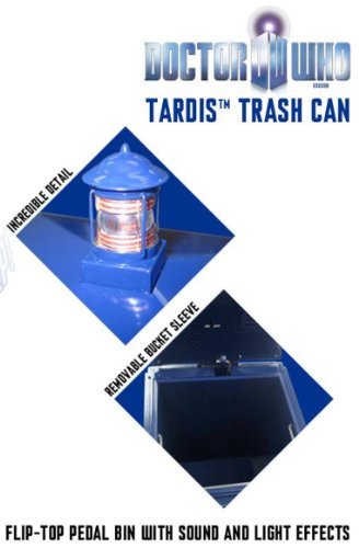 Description: This Office-sized Trash Can, a detailed model of the 11th Doctor's TARDIS offers the retro futuristic vibe your office sorely needs! Just step on the pedal to open the roof and activate the police box light detail and TARDIS materialization sound effects, and when your rubbish is safely deposited into the easy clean removable interior, release the pedal to activate the TARDIS dematerialization sound effects. The approximate height is 17 inches, but remember, it's bigger on the inside.