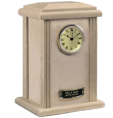 Description: Star Legacy's Deluxe Large Clock Tower Genuine Marble Funeral Adult Cremation Urn for Human Ashes - Crème colored is made with 100% genuine marble and features a precision sensitive quartz clock with second hand. Perfect for home or office, the tower clock marble urn is handcrafted with a cream marble with natural marbled patterns. Handcrafting means no two urns are exactly alike. Finished to perfection, the marble tower clock is truly a 'one-of-kind' memorial to honor your loved one. Ships with blank medallion name plate for personalized engraving (as shown) and batteries. Dimensions: 8.25 inches length x 6.5 inches width x 12.5 inches height. Capacity: 202 cubic inches (note: one pound prior to cremation equals one (1) cubic inch). The urn loads from the bottom with self-sealing, threaded cap. A matching deluxe keepsake (with clock) and small keepsake (no clock) also available.