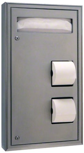 Description: Recessed installation in side wall of single compartment. Capacity: 0.8 gallon. (3.0‑L). Holds 500 toilet seat covers and two rolls of tissue. Rough wall opening: 16" width by 29-1/4" height, 4" min. depth (405 by 745 by 100mm). Theft resistant spindles. Cabinet - 18-8 S, type-304, heavy-gauge stainless steel. All-welded construction. Exposed surfaces have satin finish. Flange - 18-8 S, type-304, 22-gauge (0.8mm) stainless steel with satin finish. Drawn and beveled, one-piece, seamless construction. Doors - 18-8 S, type-304, 18-gauge (1.2mm) stainless steel with satin finish. One-piece, seamless construction. Secured to cabinet with a full-length stainless steel piano-hinge. Equipped with a tumbler lock keyed like other Bobrick washroom accessories. Toilet tissue dispensers (2) - 0.100" (2.5mm) thick ABS. Equipped with two theft-resistant, heavy-duty, one-piece molded ABS spindles. Disposal Panel - 18-8 S, type-304, 22-gauge (0.8mm) stainless steel with hemmed edges; exposed surface has satin finish. Secured to door with a spring- loaded, full-length stainless steel piano-hinge. Equipped with an international graphic symbol identifying napkin disposal. Waste Receptacle - Leak-proof molded polyethylene. Removable for servicing.