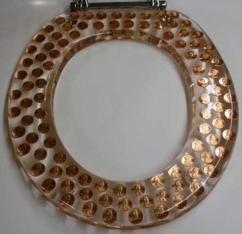 • 1 brand new PENNIES COIN THEME LUCITE RESIN TOILET SEAT in ELONGATED SIZE. This is a hard toilet seat with chrome hinges is bound to get you a lot of comments from friends and relatives. This toilet seat contains real pennies, it is made in the USA and is a much heavier quality than the imported imitations.